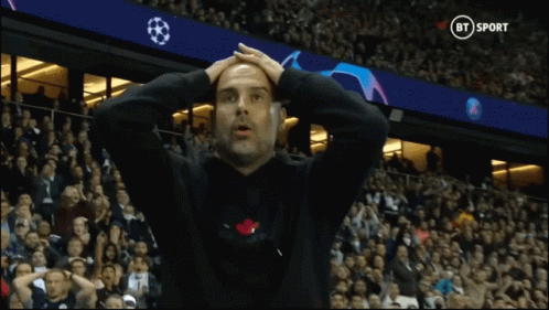 Pep Guardiola, manager of Manchester City, reacts with hands on his head, looking shocked during a match.