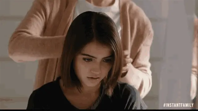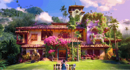 Pepa, Luisa, Mirabel, and Isabela with the Madrigal family in front of the magical Casita from Encanto.