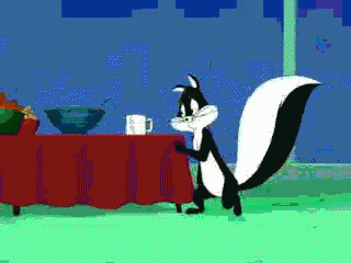 Pepe Le Pew offers a flower to Penelope Pussycat, then they share a romantic dance and kiss.