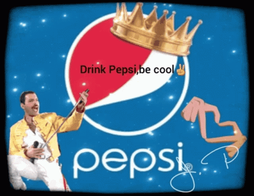 Freddie Mercury featured in a vintage Pepsi advertisement, promoting the slogan 'Pepsi Is Better' with a crown.