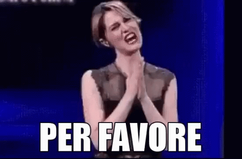 Paola Cortellesi makes a pleading face with hands clasped, with 'PER FAVORE' text overlay.