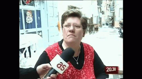 A woman in a red apron is interviewed in Bari Vecchia, Italy, by a reporter holding a microphone.