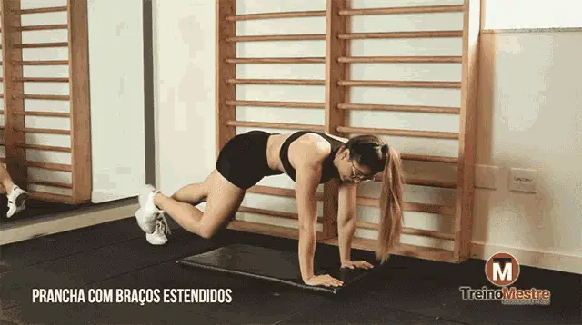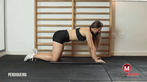 Woman performing the Perdigueiro (Bird-Dog) exercise on a mat, engaging core and glute muscles.