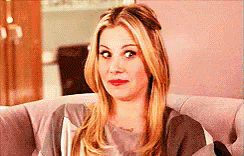 Woman makes a funny, cross-eyed face with pursed lips, expressing apology with the caption 'Perdón'.