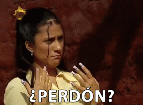 Motserrat Maranon, a woman with long nails and a yellow shirt, makes a funny face while asking "Pardon?" in Spanish.