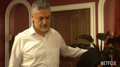 Man in a white shirt with grey hair looking down, with the word 'PERDON' displayed, alongside the Netflix logo.