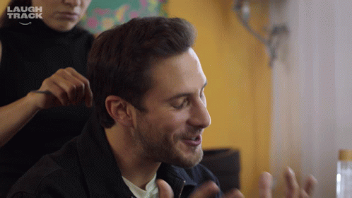 Sebastian Ibarra, from Como Sobrevivir Soltero, reacts with embarrassment while getting his hair done, then smiles.