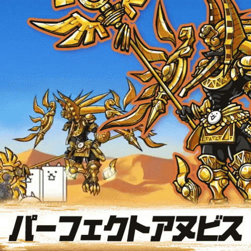 Animated scene featuring Perfect Anubis and Battle Cats characters in a desert battle.