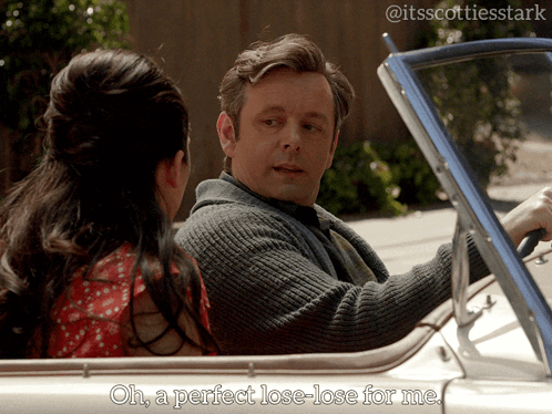 Michael Sheen as Bill Masters in a car, expressing a 'perfect lose-lose' situation.