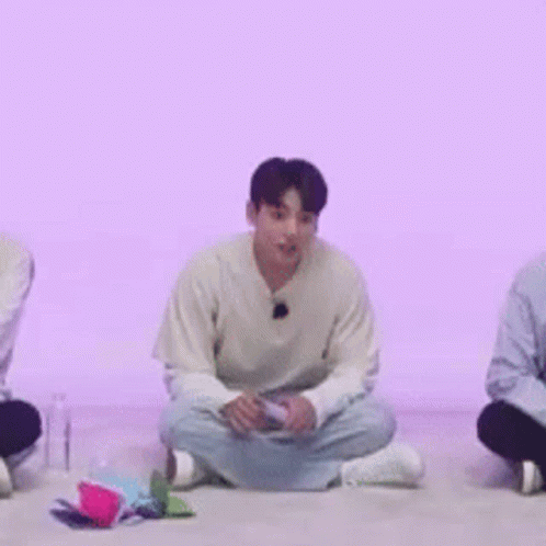 Jungkook sits on the floor, raising his fist in an energetic gesture against a purple background.