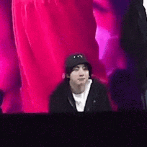 Jungkook from BTS makes a heart gesture at a concert, wearing a black hat.