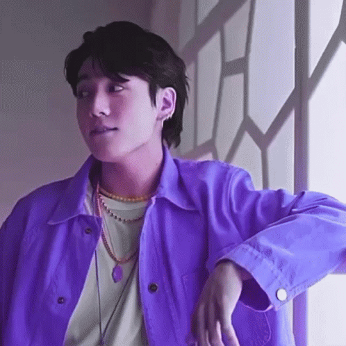 Perfectboykoo in a vibrant purple jacket, looking around a room with a thoughtful expression.