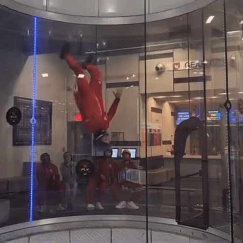 Perfectboykoo Thv performs acrobatic maneuvers in a red suit during an indoor skydiving session.