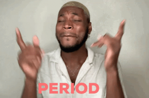 Man with light hair and beard makes a funny face as the word 'PERIOD' appears on screen.