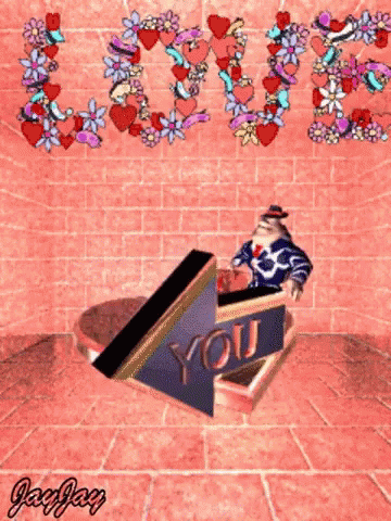 Perle B Jayjay in a pinstripe suit on a rotating platform, with 'LOVE YOU' and 'LOVE TO' arrows.
