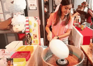 A young woman skillfully makes sweet cotton candy using a machine at a vibrant market stall.