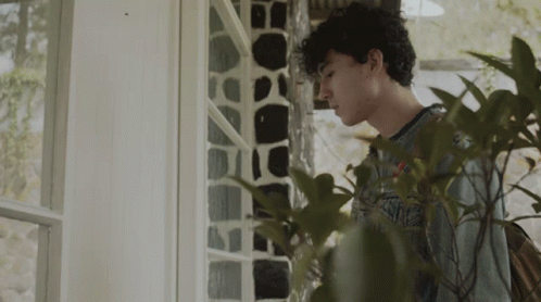 A young man with curly hair nervously knocks on a window or door frame, looking hesitant and anxious.