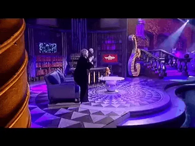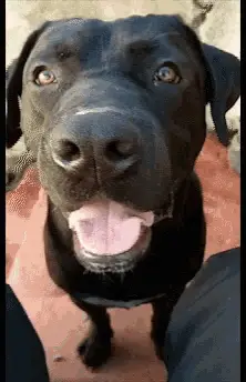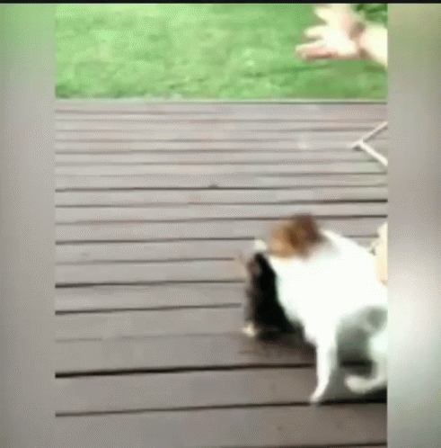 A playful dog interacts with a small kitten on a wooden deck, with the kitten rolling over during their game.