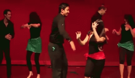 A group of dancers performs a lively Persian dance on stage against a plain red backdrop.