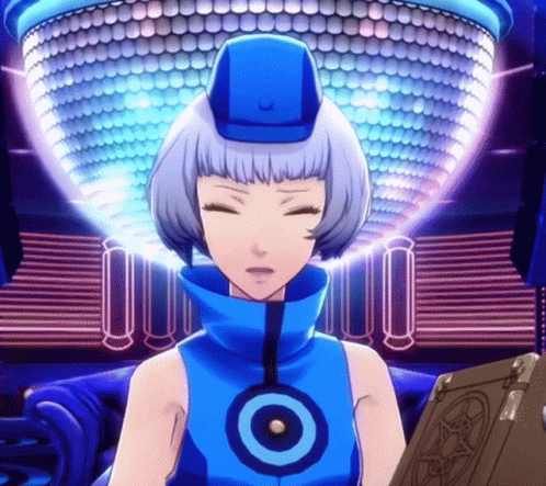 Elizabeth from Persona 3 in a blue outfit, holding a book in a vibrant blue room.