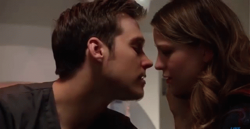 A man and a woman share a passionate kiss, their faces close together in an intimate moment.