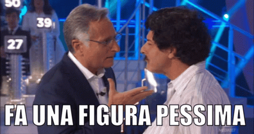 Paolo Bonolis confronts another man on the set of Ciao Darwin, with the text 'Fa Una Figura Pessima' displayed.