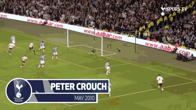 Peter Crouch scores a crucial goal for Tottenham Hotspur (Spurs) in May 2010, celebrating with teammates Modric, Bale, and Assou-Ekotto.