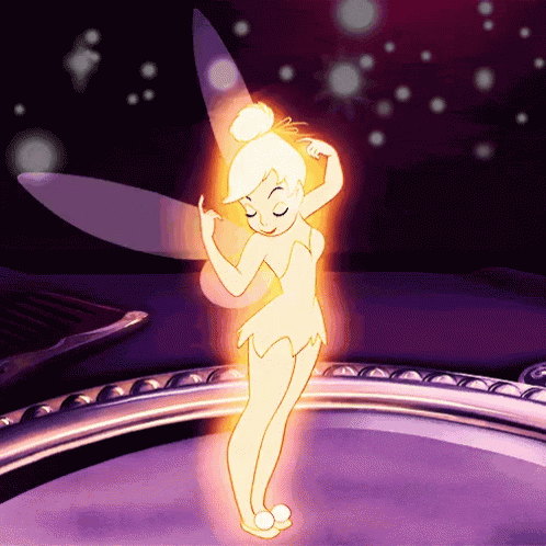 Tinkerbell, the beloved fairy from Peter Pan, glows and performs an enchanting dance on a starry stage.