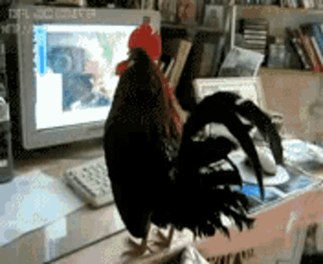 A black rooster stands on a computer desk, pecking at the keyboard in front of a monitor.