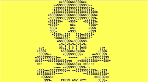 Petya Ransomware warning screen featuring a skull and crossbones made of dollar signs and 'u' characters.
