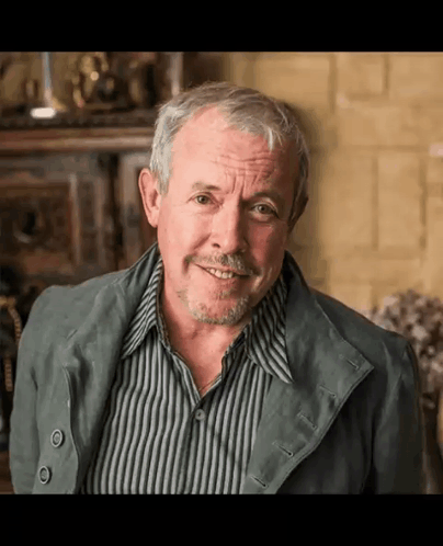 Andrey Makarevich, the singer and poet, smiles while wearing a grey jacket and striped shirt.