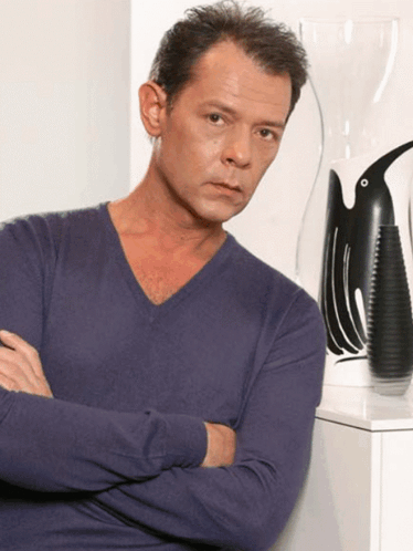 Russian singer Vadim Kazachenko in a purple sweater, then in a white jacket on a city street.