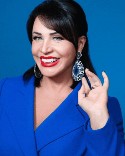 Nadezhda Babkina, the famous Russian singer, actress, and TV presenter, smiles brightly in a blue blazer.