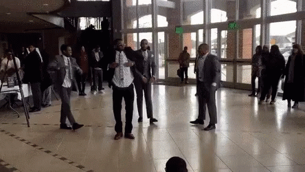 Phi Beta Sigma fraternity members in suits and ties perform a dynamic stepping routine in a spacious hall.