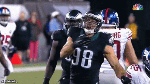 Philadelphia Eagles player Connor Barwin celebrates on the field with a chest tap.