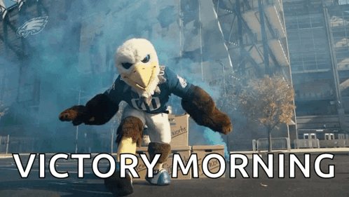 Philadelphia Eagles mascot Swoop celebrates 'Victory Morning' outside a stadium with blue smoke.
