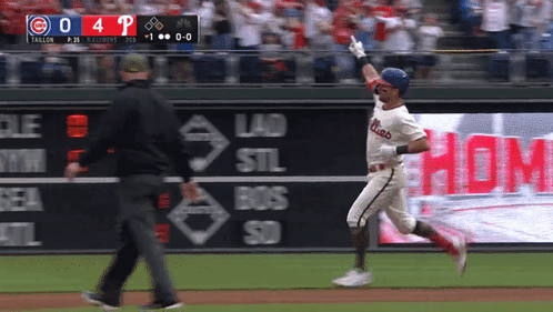 Philadelphia Phillies player Kody Clemens rounds the bases after hitting a home run during a baseball game.