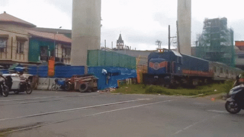 A blue Philippine National Railways (PNR) train, numbered 918, passes through a city area in the Philippines.