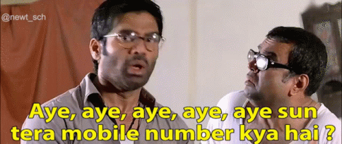 Baburao and Shyam from Phir Hera Pheri in a classic comedic moment, asking for a mobile number.