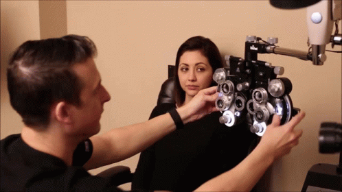 A man conducts an eye exam on a woman using a phoropter, adjusting lenses for vision measurement.