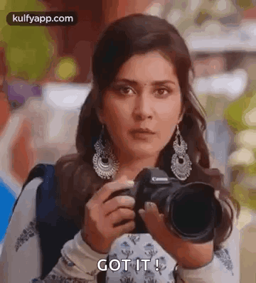Actress Raashi Khanna, embodying her photographer life, holds a camera and confidently declares 'Got it!'