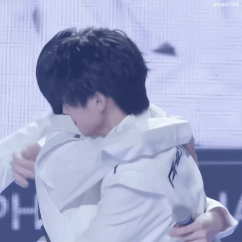 Phutatchai and Ashirakorn (AA) share a heartfelt hug on stage, celebrating their bond.