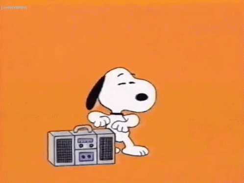 Snoopy holding a boombox and dancing on an orange background.