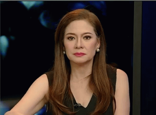 Filipina journalist Pia Hontiveros looking directly at the camera, wearing a black top and pearl earrings in a studio.