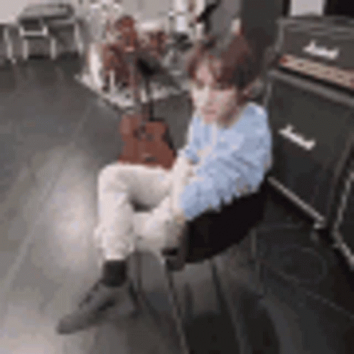 NCT Dream's Chenle Zhong sits on a chair, looking bored and unimpressed in a music studio setting.