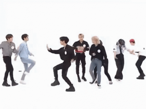 Pianistchenle and Stray Kids Skz members dancing together in a fun, energetic performance on a white background.