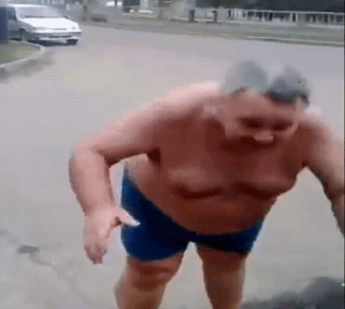 A shirtless man in blue shorts attempts to run but stumbles and falls on the pavement.
