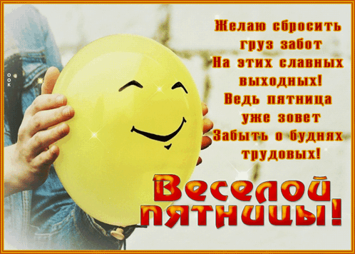 A person holds a yellow smiley balloon with a message wishing a happy Friday and a relaxing weekend.