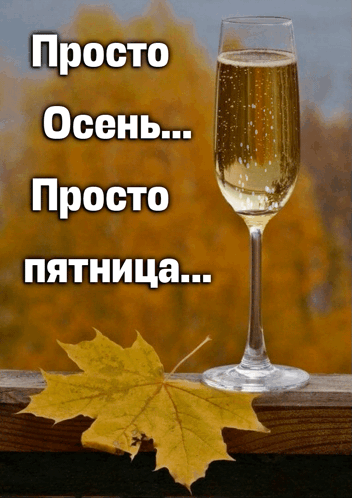 A glass of sparkling champagne and a yellow autumn leaf on a wooden railing, with a blurred autumn background.
