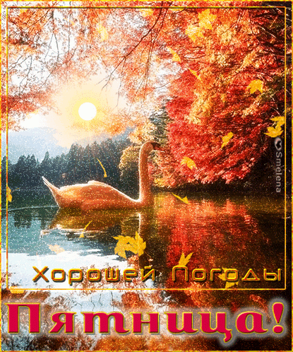 Beautiful autumn scene with a swan on a lake, golden leaves, and a bright sun, wishing a good weather Friday.
